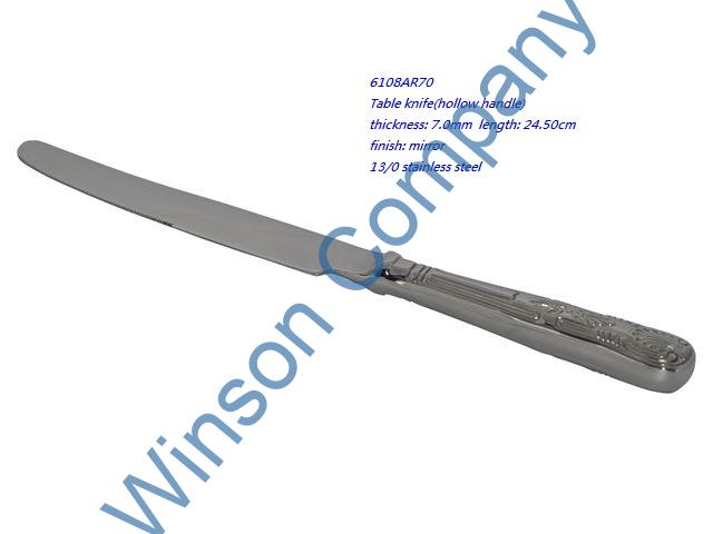 6108AR70-Table knife(hollow handle) ← Previous Next → 6108AR70 Table knife(hollow handle) thickness: 7.0mm length: 24.50cm finish: mirror 13/0 stainless steel