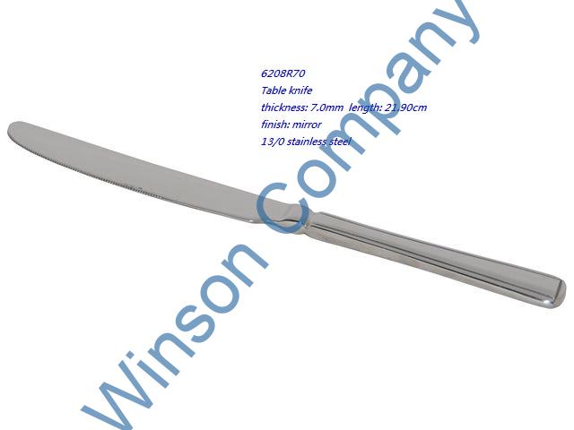 6208R70-Table knife ← Previous Next → 6208R70 Table knife thickness: 7.0mm length: 21.90cm finish: mirror 13/0 stainless steel