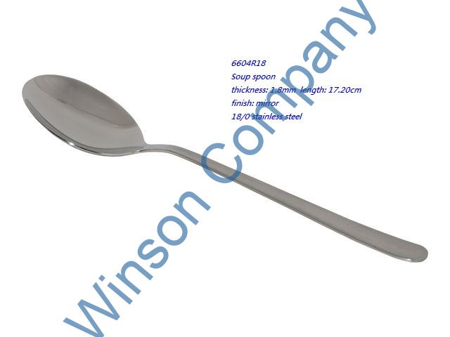 6604R18-Soup spoon ← Previous Next → 6604R18 Soup spoon thickness: 1.8mm length: 17.20cm finish: mirror 18/0 stainless steel