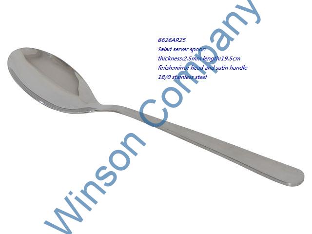 6626AR25-Salad server spoon ← Previous Next → 6626AR25 Salad server spoon thickness:2.5mm length:19.5cm finish:mirror head and satin handle 18/0 stainless steel