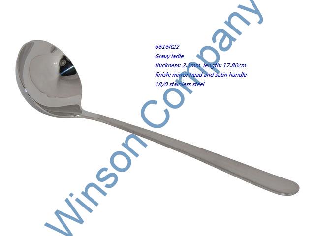 6616R22-Gravy ladle ← Previous Next → 6616R22 Gravy ladle thickness: 2.2mm length: 17.80cm finish: mirror head and satin handle 18/0 stainless steel