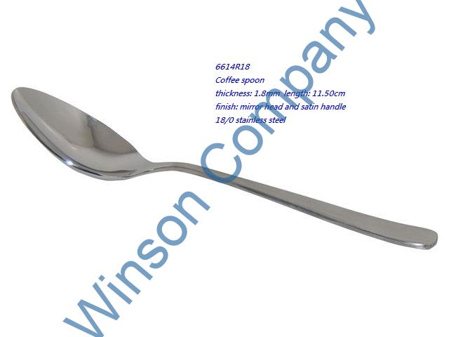 6614R18-Coffee spoon ← Previous Next → 6614R18 Coffee spoon thickness: 1.8mm length: 11.50cm finish: mirror head and satin handle 18/0 stainless steel