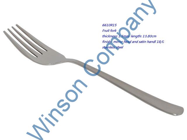6610R15-Fruit fork ← Previous 6610R15 Fruit fork thickness: 1.5mm length: 13.80cm finish: mirror head and satin handle 18/0 stainless steel