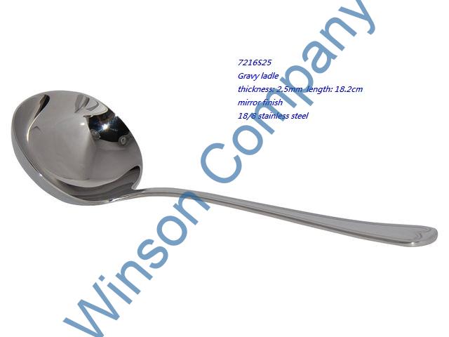 7216S25-Gravy ladle ← Previous Next → 7216S25 Gravy ladle thickness: 2.5mm length: 18.2cm mirror finish 18/8 stainless steel
