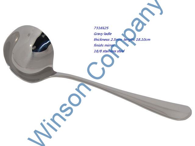 7316S25-Gravy ladle ← Previous Next → 7316S25 Gravy ladle thickness: 2.5mm length: 18.10cm finish: mirror 18/8 stainless steel