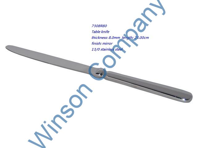 7308R80-Table knife ← Previous Next → 7308R80 Table knife thickness: 8.0mm length: 23.00cm finish: mirror 13/0 stainless steel