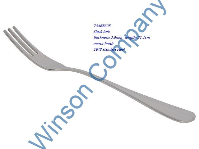 7346BS25-Steak fork ← Previous Next → 7346BS25 Steak fork thickness: 2.5mm length: 21.1cm mirror finish 18/8 stainless steel