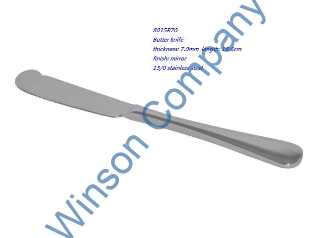 8015R70-Butter knife ← Previous Next → 8015R70 Butter knife thickness: 7.0mm length: 18.6cm finish: mirror 13/0 stainless steel
