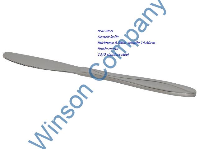 8507R60-Dessert knife ← Previous Next → 8507R60 Dessert knife thickness: 6.0mm length: 19.80cm finish: mirror 13/0 stainless steel
