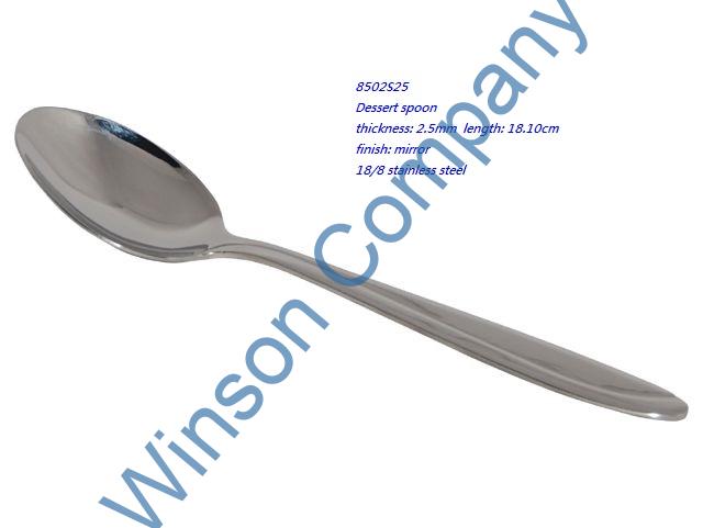 8502S25-Dessert spoon ← Previous Next → 8502S25 Dessert spoon thickness: 2.5mm length: 18.10cm finish: mirror 18/8 stainless steel
