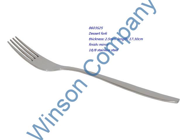 8603S25-Dessert fork ← Previous Next → 8603S25 Dessert fork thickness: 2.5mm length: 17.30cm finish: mirror 18/8 stainless steel