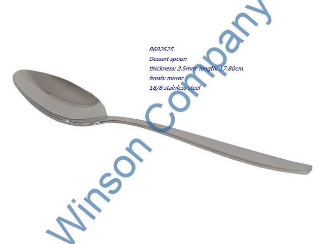 8602S25-Dessert spoon ← Previous Next → 8602S25 Dessert spoon thickness: 2.5mm length: 17.80cm finish: mirror 18/8 stainless steel
