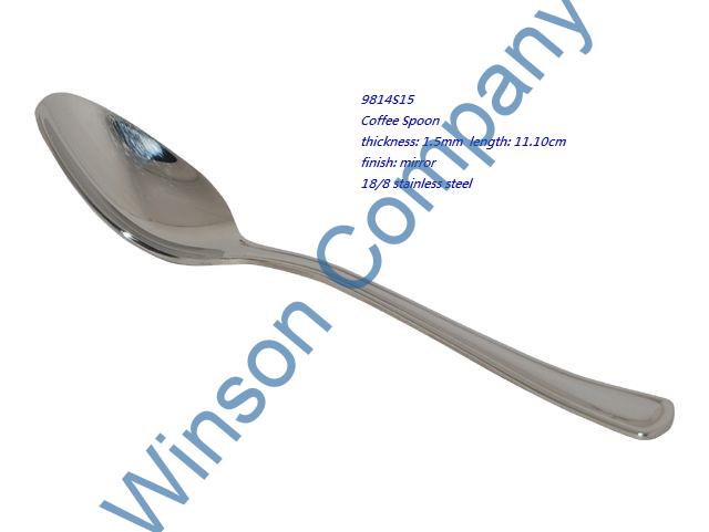 9814S15-Coffee Spoon ← Previous Next → 9814S15 Coffee Spoon thickness: 1.5mm length: 11.10cm finish: mirror 18/8 stainless steel
