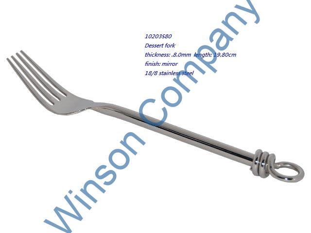 10203S80-Dessert fork ← Previous Next → 10203S80 Dessert fork thickness: .8.0mm length: 19.80cm finish: mirror 18/8 stainless steel