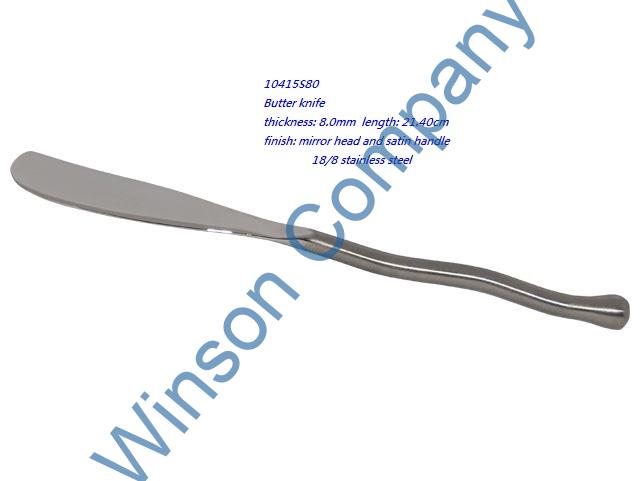 10415S80-Butter knife ← Previous Next → 10415S80 Butter knife thickness: 8.0mm length: 21.40cm finish: mirror head and satin handle 18/8 stainless steel