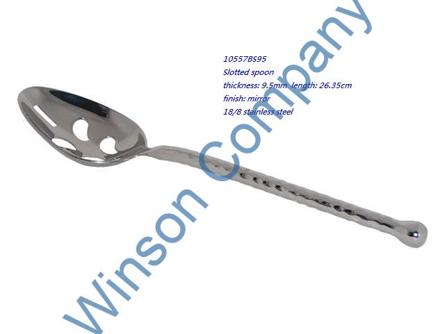 10557BS95-Slotted spoon ← Previous Next → 10557BS95 Slotted spoon thickness: 9.5mm length: 26.35cm finish: mirror 18/8 stainless steel