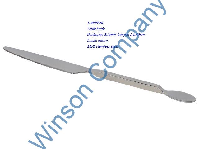 10808S80-Table knife ← Previous Next → 10808S80 Table knife thickness: 8.0mm length: 24.60cm finish: mirror 18/8 stainless steel