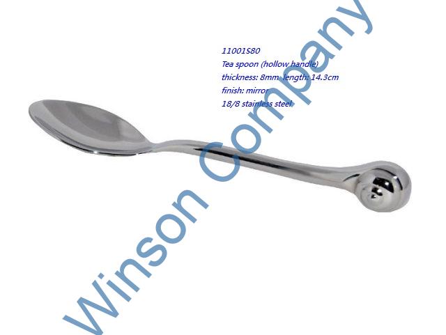 11001S80-Tea spoon ← Previous Next → 11001S80 Tea spoon (hollow handle) thickness: 8mm length: 14.3cm finish: mirror 18/8 stainless steel