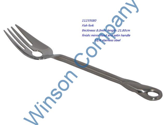 11235S80-Fish fork ← Previous Next → 11235S80 Fish fork thickness: 8.0mm length: 21.80cm finish: mirror head and satin handle 18/8 stainless steel