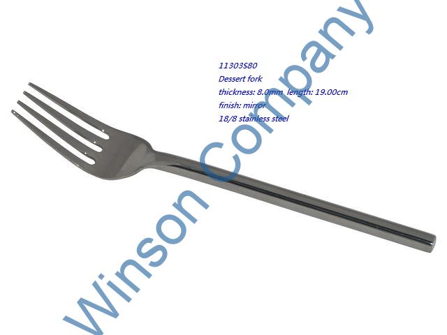 11303S80-Dessert fork ← Previous Next → 11303S80 Dessert fork thickness: 8.0mm length: 19.00cm finish: mirror 18/8 stainless steel