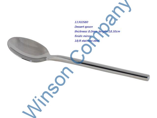 11302S80-Dessert spoon ← Previous Next → 11302S80 Dessert spoon thickness: 8.0mm length: 18.30cm finish: mirror 18/8 stainless steel