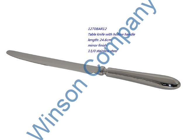 12708AR12-Table knife ← Previous Next → 12708AR12 Table knife with hollow handle length: 24.6cm mirror finish 13/0 stainless steel