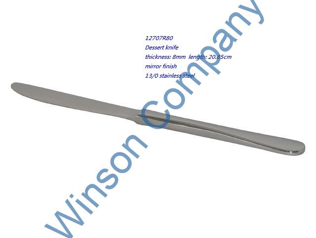 12707R80-Dessert knife ← Previous Next → 12707R80 Dessert knife thickness: 8mm length: 20.85cm mirror finish 13/0 stainless steel