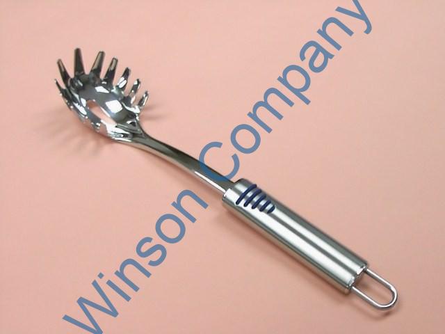 KN5965 ← Previous Next → KN5965 Spaghetti ladle w/ santophene stripes on oval handle front & end cap+hook 18/10 stainless steel