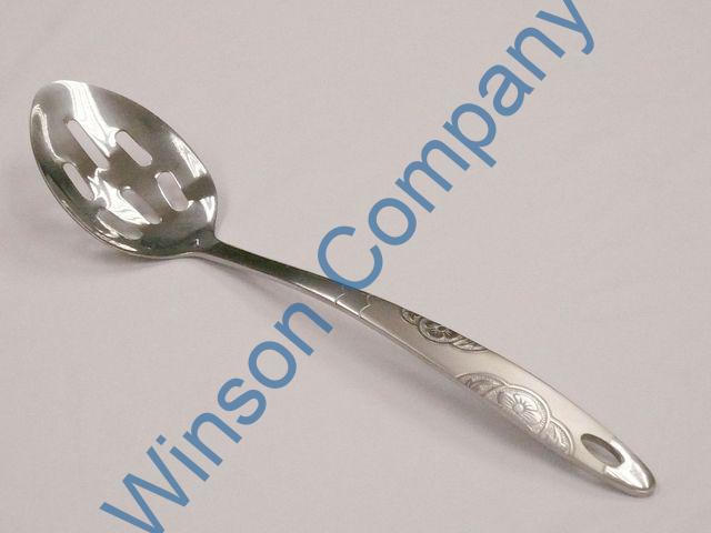 KN6187 ← Previous Next → KN6187 Cooking slotted spoon with flower pattern on handle 32.8cm(L) thickness: 3.5mm 18/0 stainless steel
