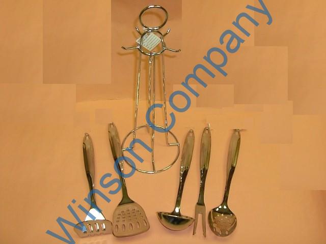 KN6263 Next → KN6263 Kitchen tools 5 pcs/set with wire stand : incl. soup ladle slotted turner cooking fork slotted spoon potato masher & wire stand. 18/8 stainless steel