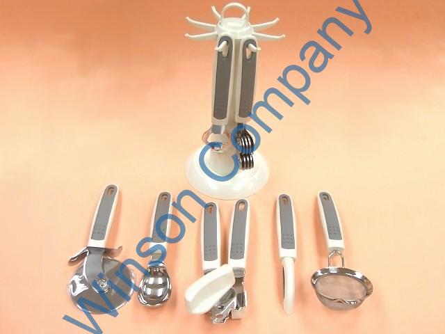 KN6322 Kitchen gadget set 7 pcs set w/ 8 hooks revolving stand w/ handle #201R incl. knife sharpener P-shape peeler bottle & can opener ice cream scoop pizza cutter bottle opener mesh strainer 18/0 stainless steel