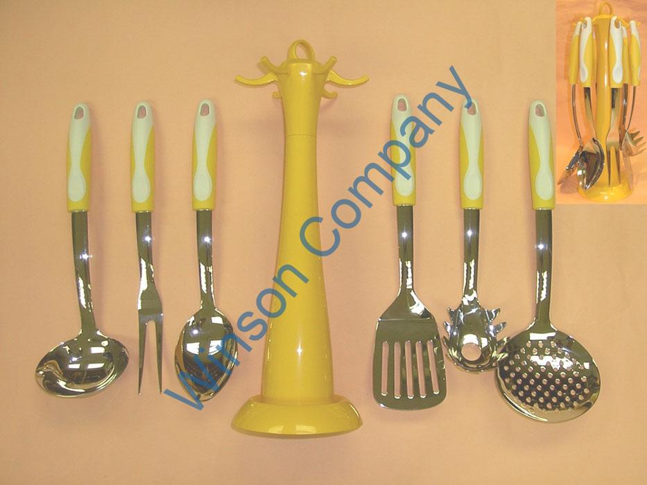KN6387 Next → KN6387 7-pc set of Kitchen tools each set contain: slotted turner cooking spoon spaghetti server cooking fork soup ladle rice skimmer revolving stand colour: light blue yellow grey dark blue 18/0 stainless steel