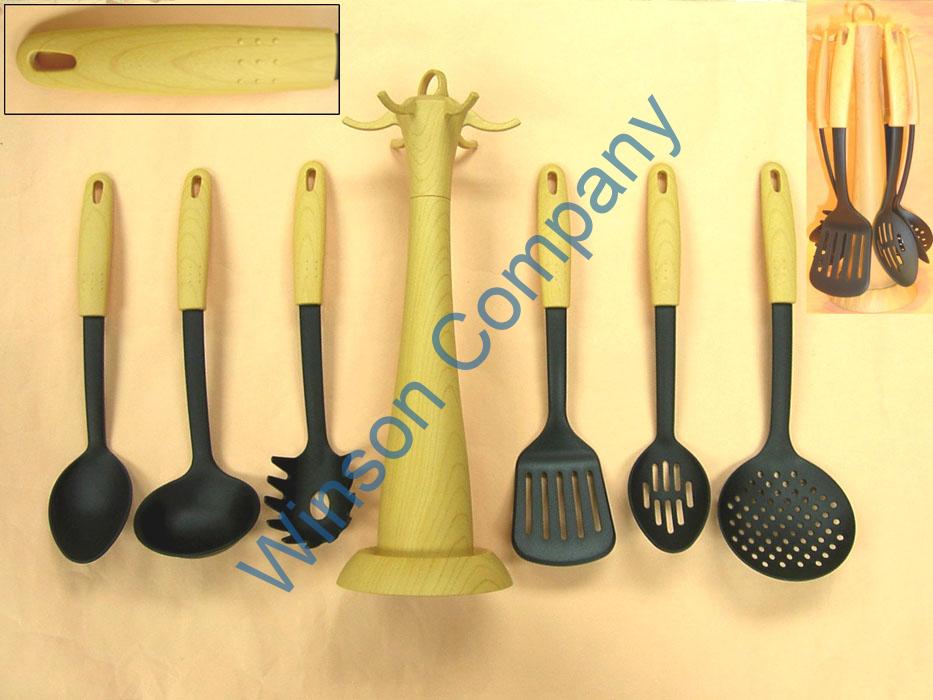 KN6388 ← Previous Next → KN6388 7-pc Black mat nylon kitchen tools set wooden grain each contain: slotted turner slotted spoon cooking spoon spaghetti server rice skimmer soup ladle NL&PL