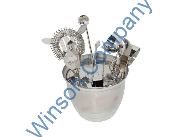 Bar set — BA5211 BA5211: 8pcs set of circle barware 1 x double jiger 1 x Bar knife 1 x Stirring stick 1 x bottle opener 1 x cocktail strainer 1 x ice tongs 1 x stand 1 x ice bucket dia 137mm, 110mm height BA5211 Bar set of 8 pcs including: double jigger bar knife stirring stick bottle opener cocktail strainer ice tongs and ice bucket (13.7cmdia x 11cmH) 18/8 stainless steel
