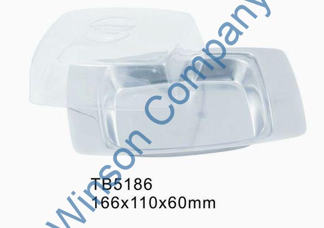 Butter Dish TB5186 TB5186: size 166 x 110 x 60mm, with plastic cover TB5186 Butter dish with clear plastic cover size: 166mm(L) x 110mm(W) x 60mm (H) 18/0 stainless steel