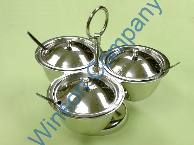 TB5576 Condiment Set (4 pcs) Relish set with 3 s/s bowl and s/s spoon with revolving tray. 18/8 stainless steel TB5576 Condiment Set (4 pcs) Relish set with 3 s/s bowl and s/s spoon with revolving tray. 18/8 stainless steel