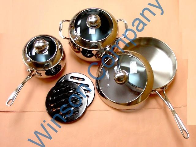 CK5081 Cookware Set(Belly) 8-pc SetIncl. 1x 16×9.5cm Sauce pan 1x 20x12cm Sauce pot 1x 24x6cm Fry pan 2x Black bakelite Underlay 18/8 stainless steel