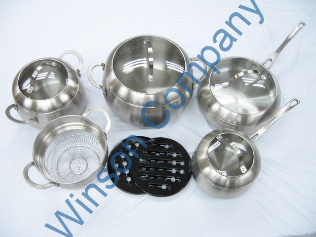 CK5094 Cookware set incl 1 x 16×9.5cm covered saucpan 1 x 18×11 covered saucepot + 18×12 open boiler/basket 1 x 20x12cm covered saucepot 1 x 24x6cm covered frypan 2 x black phenolic round cooling tray