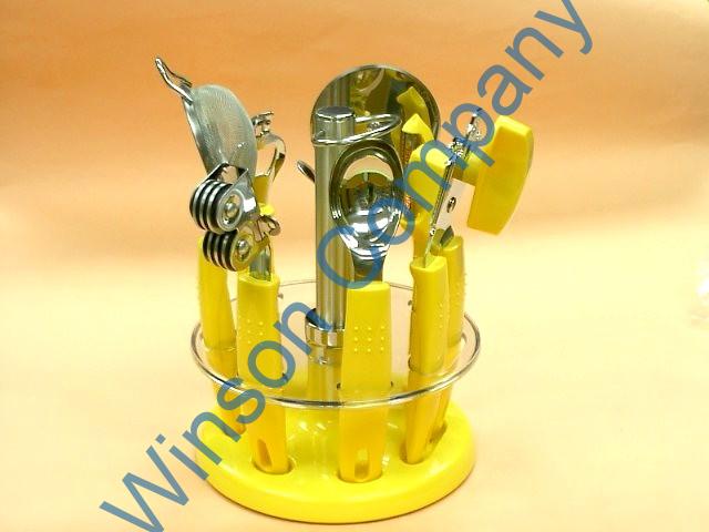 KN6327 Kitchen gadget set incl.7 pcs set w/ short revolving stand; 1x ice cream scoop; 1 x bottle opener; 1 x knife sharpener; 1 x mesh strainer; 1 x peeler; 1 x pizza cutter; 1 x bottle & can opener.