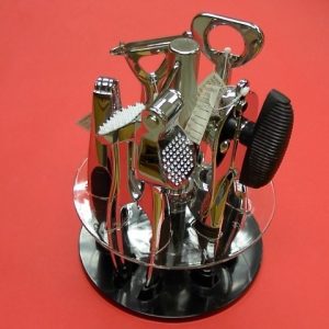 - KN6264 5 Pc set of chrome plated kitchen gadgets set with plastic revolving stand with rubber hand Ggrip incl.: can opener garlic press Y-shape peeler nutcraker corkscrew & revolving stand. ZA