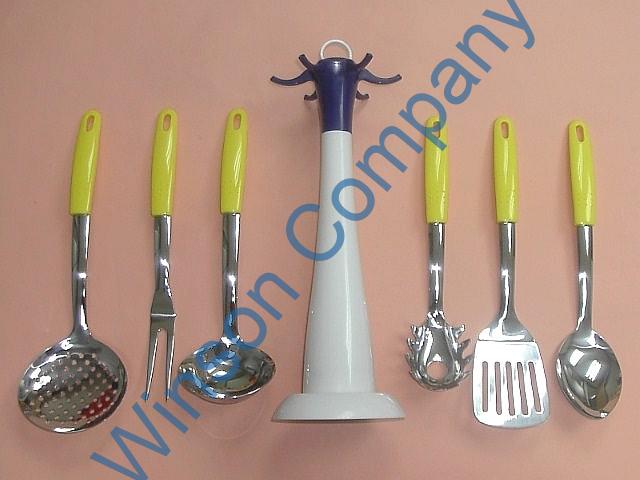 KN5779 Tools set of 7 pcs incl.: cooking fork rice skimmer solid spoon soup ladle slotted turner spaghetti server and revolving stand