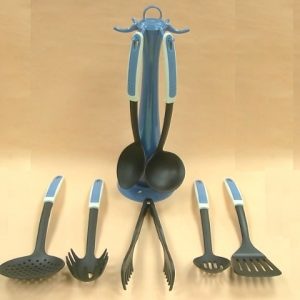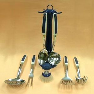 - KN6321 Kitchen tool set 6 pcs set + tongs and 6 hooks revolving rack w/ sucker w/ handle #201R incl. slotted turner slotted spoon cooking spoon rice skimmer soup ladle spaghetti server NL