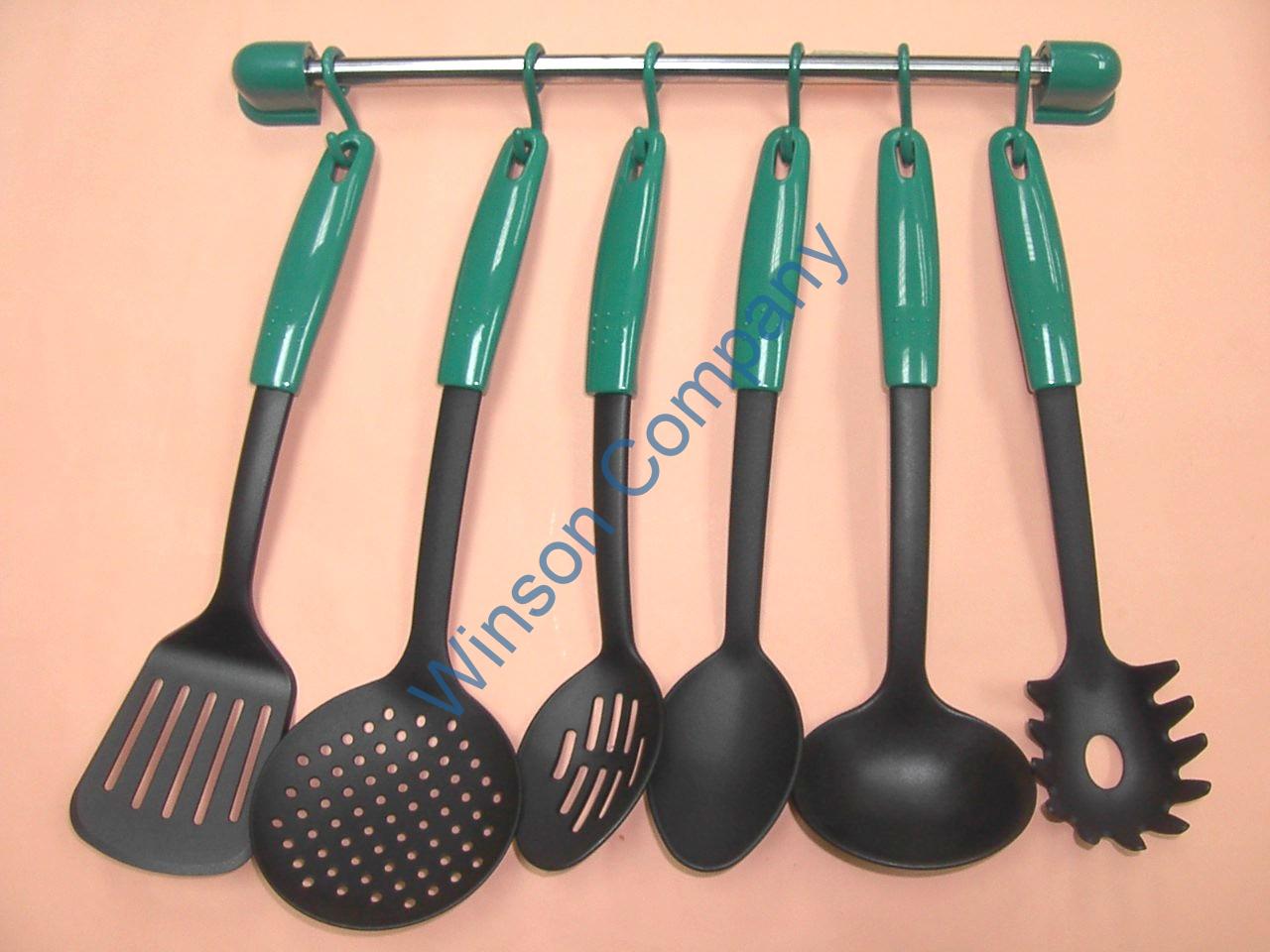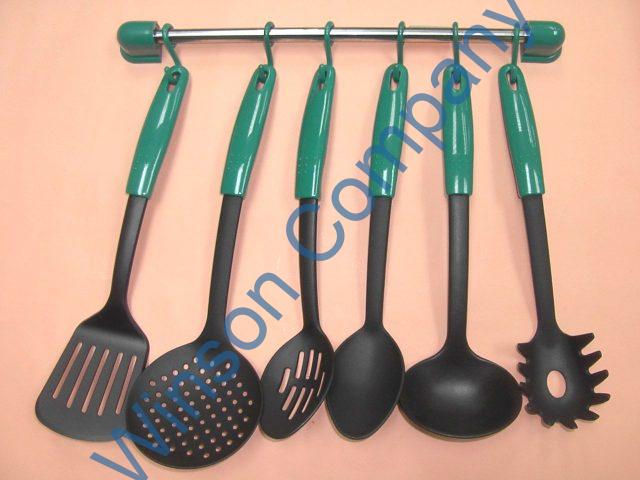 KN6326 Tools set of 7 pcs incl.: slotted turner slotted spoon cooking spoon rice skimmer soup ladle spaghetti server & hanger with 6 plastic hooks.