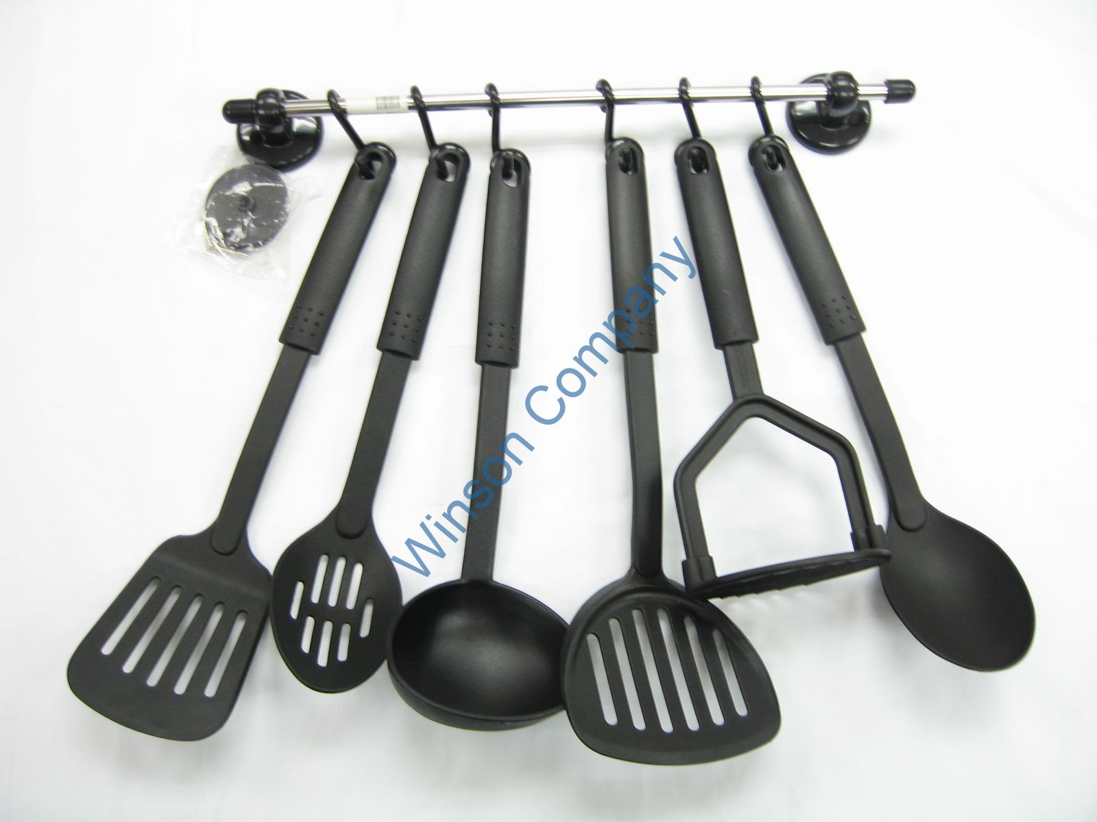 KN6432 7 pcs nylon kitchen tools set incl: Soupladle cooking spoon slooted spoon potato masher slotted turner and hanger with 6 hooks