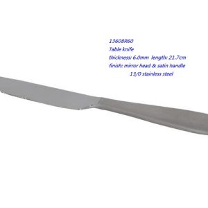 - 13608R60 Table knife thickness: 6.0mm length: 21.7cm finish: mirror head & satin handle 13/0 stainless steel