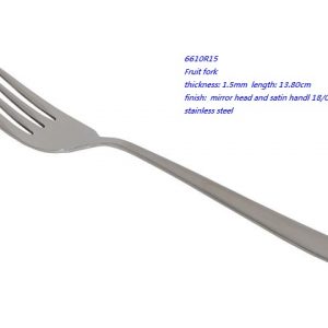 - 6610R15 Fruit fork thickness: 1.5mm length: 13.80cm finish: mirror head and satin handle 18/0 stainless steel