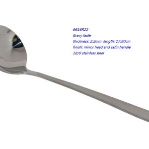 - 6616R22 Gravy ladle thickness: 2.2mm length: 17.80cm finish: mirror head and satin handle 18/0 stainless steel