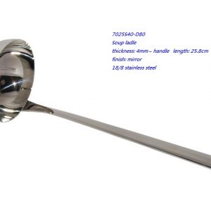 - 7025S40-D80 Soup ladle thickness: 4mm – handle length: 25.8cm finish: mirror 18/8 stainless steel