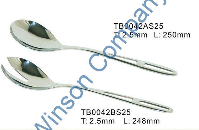 Salad Serving Spoon Set TB0042AS25 TB0042BS25 TB0042AS25: 2.5mm thickness, 250mm length TB0042BS25: 2.5mm thickness, 248mm length TB0042AS25 Salad serving spoon thickness: 2.5mm length: 24.9cm 18/8 stainless steel TB0042BS25 Salad serving fork thickness: 2.5mm length: 24.75cm 18/8 stainless steel
