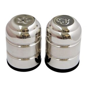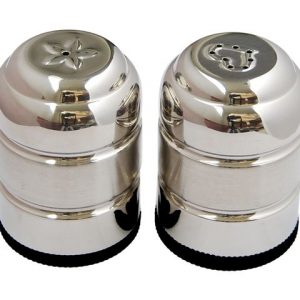 Salt & Pepper Set TB5832 TB5833 TB5832: Dia.68mm, 75mm(H) TB5833: Dia.42mm, 60mm(H) TB5833 Mini jumbo set 2pcs salt & pepper shakes Dia.42mm, 60mm(H) 18/8 stainless steel TB5832 Jumbo cruet set 2pcs salt & pepper shakes. Dia.68mm, 75mm(H) 18/8 stainless steel